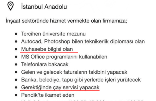 Ülkemizde bugün herhangi bir iş ilanına baktığınızda “Yönetici Asistanı/Sekreter” diye duyuru yapılan pozisyonlarda bile “en az iki dil bilen, ehliyetli, Photoshop’a hâkim, sosyal medya yönetimi tecrübeli, aynı zamanda çay kahve servisi yapabilen” adaylar aranıyor. Üstelik bu yeteneklerin karşılığı genellikle ASGARİ ÜCRET oluyor. Özel sektör, gençleri “çok yönlü çalışan” maskesi altında ucuz iş gücü olarak sömürüyor. Peki bu kadar yetkin bir insan neden açlık sınırında çalışsın?