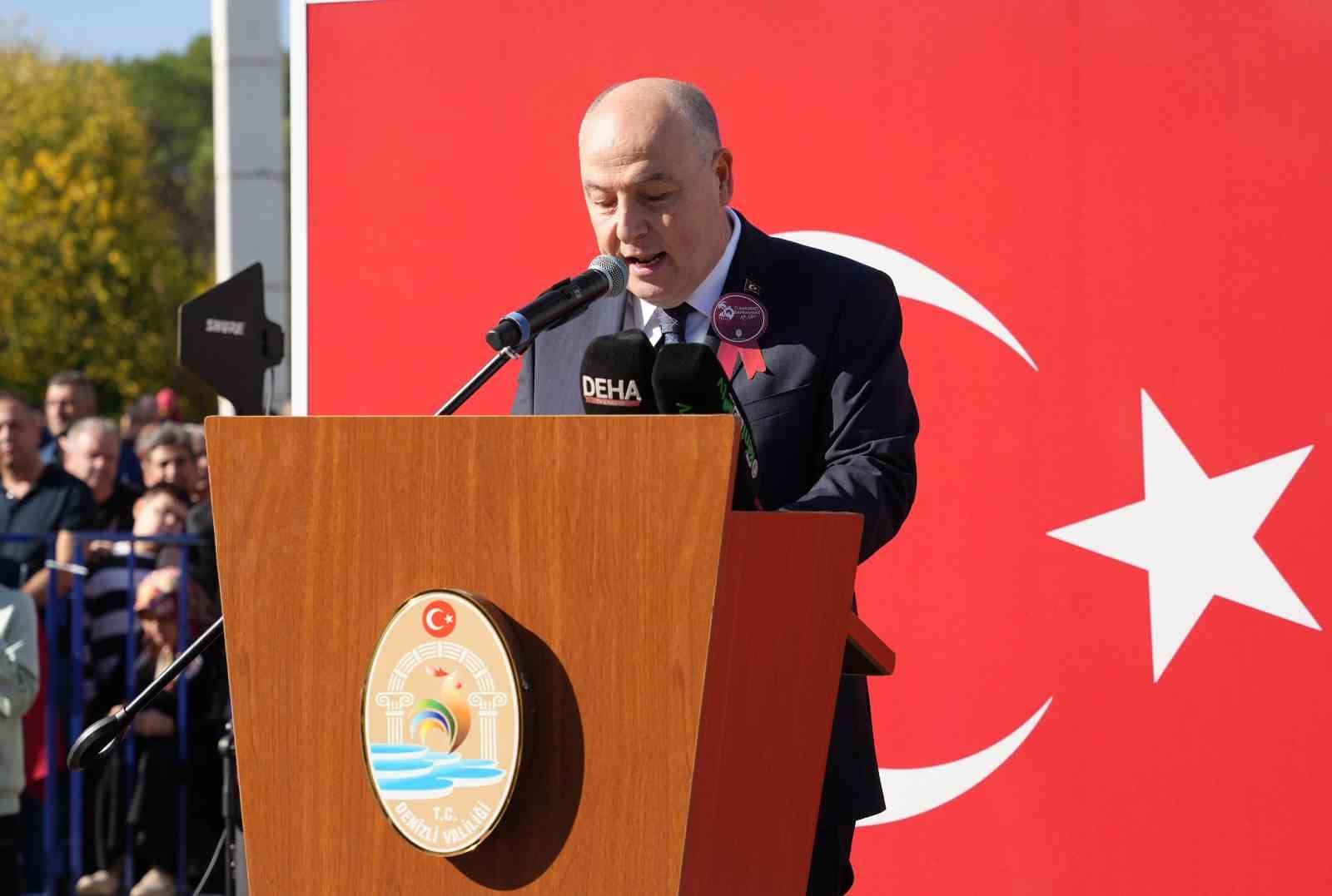 Törenin sonrasında konuşmalarını yapmak üzere kürsüde vatandaşların 29 Ekim Cumhuriyet Bayramını kutladığını belirten Denizli Valisi Ömer Faruk Coşkun, “Kıymetli Denizlililer, Türk milletinin karakterine en uygun yönetim biçimi olan Cumhuriyet inançla, fedakarlıklar ve kahramanlıkla yazılmış milli mücadele destanımız ile yeniden dirilişimizin müjdecisi olmuştur. Asırlardır bağımsız yaşama iradesinden taviz vermeyen Aziz milletimiz gazi Mustafa Kemal Atatürk’ün önderliğinde ya İstiklal ya Ölüm diyerek tarihi altın harflerle geçen büyük zaferin ardından Cumhuriyeti kurmuştur” dedi.