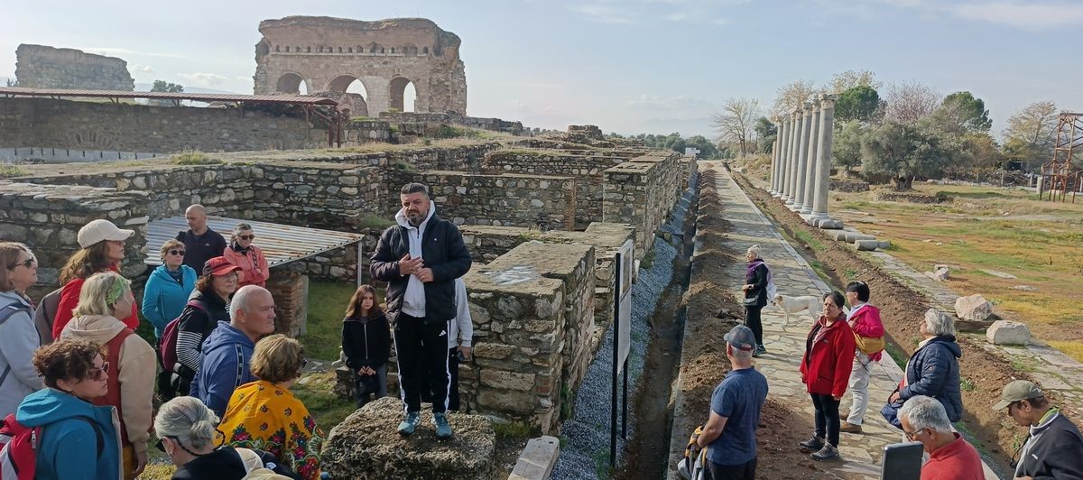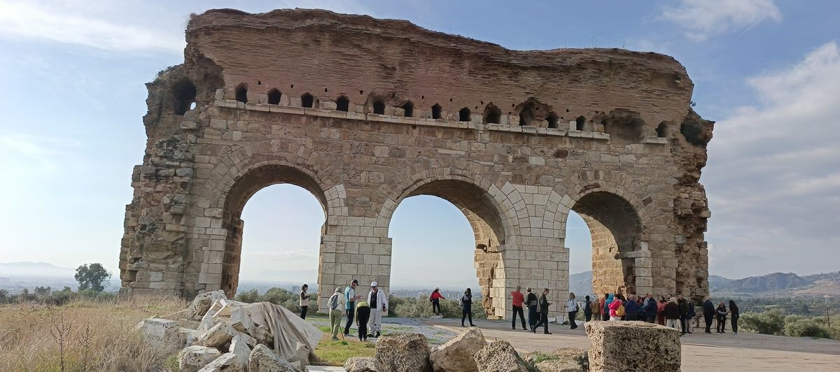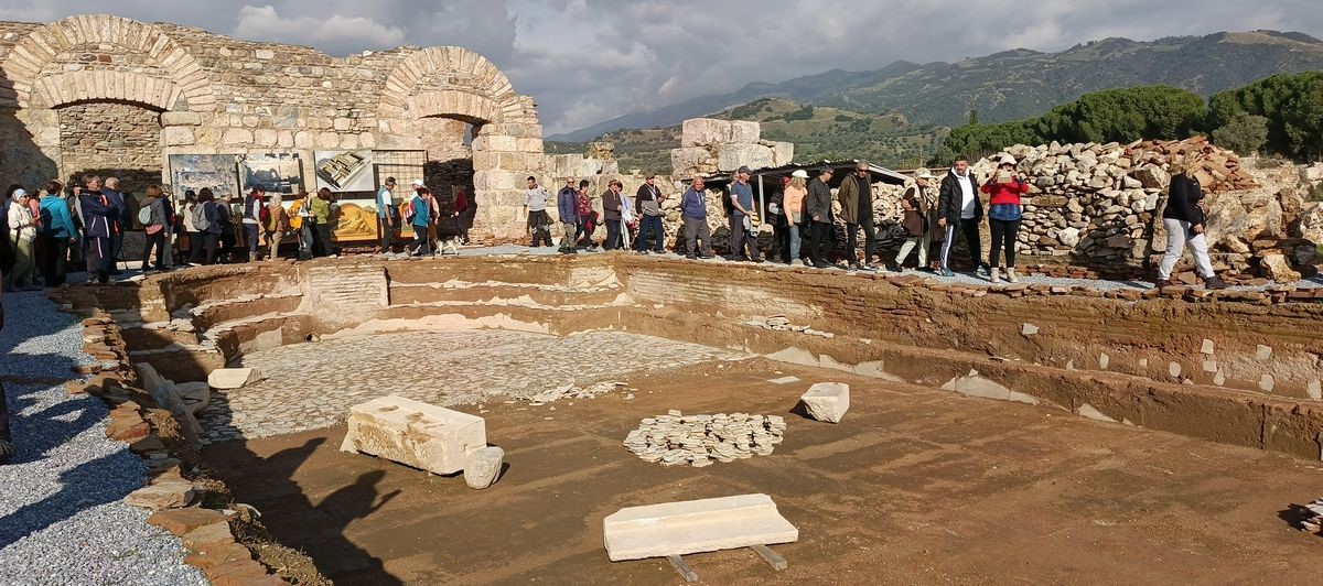 Gezi hakkında açıklama yapan EKODOSD Başkanı Bahattin Sürücü; “Aydın’da kentin yanı başında olan, Strabon’un ’masa biçimli bir yükselti’ dediği Tralleis Antik Kenti’ne gittik bu hafta. Profesyonel turist rehberi Hakan Bahçecioğlu’yla birlikte, antik çağdaki anlamı ’topraklar arasında’ olan Mesogis Dağları’nın yamaçlarında yer alan harika peyzajlar oluşturan Kızılçay vadisi rotamızın ilk durağı oldu. Karagözler yaylasından su getiren Kızılçay’ın geçit vermeyen yarlarının içinde gümüş bir gerdanlık gibi duran olağanüstü bir yapıyı görmek için çayın içine indik. Yağan yağmurlardan sonra çaydan geçebilir miyiz diye düşünürken, ne yazık ki su birikintisine bile rastlayamadık. Çayın içinde yürürken en önemli sorunun susuzluk olduğunu düşündük. Tralleis’e su taşıyan Roma Dönemi’ne ait bir mühendislik harikası olan Karakemer’in görkemli siluetini izleyip, kilometrelerce yukarıdan suları kentlerine nasıl taşıdıklarını gördük. Asırlardır ayakta kalan ölmez ağaç zeytinin ’dağlarından yağ akar’ sözünün gerçekliğini yerinde izledik. Aydın’ın doğal peyzajına büyük zenginlik kazandıran, Tralleis antik kentinin arkasında panoramik bir tablo gibi duran kızıl toprakların yükseltilerinden bir seyir yaptık. Peyzaj çalışmaları devam eden ve önümüzdeki aylarda ziyaretçiye açılması planlanan Tralleis antik kentine geldik. Ziyarete açılmaya hazırlanan Efeler ilçesi, Topyatağı mevkiinde yer alan Tralleis antik kentiyle ilgili bir sunum yapıldı. Üçgözler olarak bilinen devasa yapının Aydın’ın tanıtımında çok önemli bir yeri olduğu, bu kompleksten çok önemli bilim insanları ve sporcuların çıktığı ve havuzda yapılan çalışmalar anlatıldı. Zengin Roma Villaları ve çevresinde yer alan metal malzeme üretiminin yapıldığı işlikler ve çıkarılan eserler anlatıldı. Tralleis antik kentinin, Efes kadar önemli bir turizm destinasyonu haline geleceğini anlatan kazı başkanı Prof. Dr. Murat Çekilmez, bu nedenle çevre düzenleme projesi kapsamında karşılama merkezi, yürüyüş yolları, ışıklandırma gibi yeniliklere önem verdiklerini söyledi. Biz de ziyarete açıldıktan sonra Kuşadası’ndan da tarihe duyarlı yerli yabancı birçok insanın Tralleis’e ziyaret etmesi için gerekli çalışmaları yapacağımızı söyledik. Aydın’a bu kadar yakın hem doğal hem de tarihi zenginliklerin bulunması çok önemlidir. Bu değerlerin gelecek kuşaklara korunarak ulaştırılması, Aydınlıların sahip çıkması ve destekleri sayesinde olacaktır” dedi.