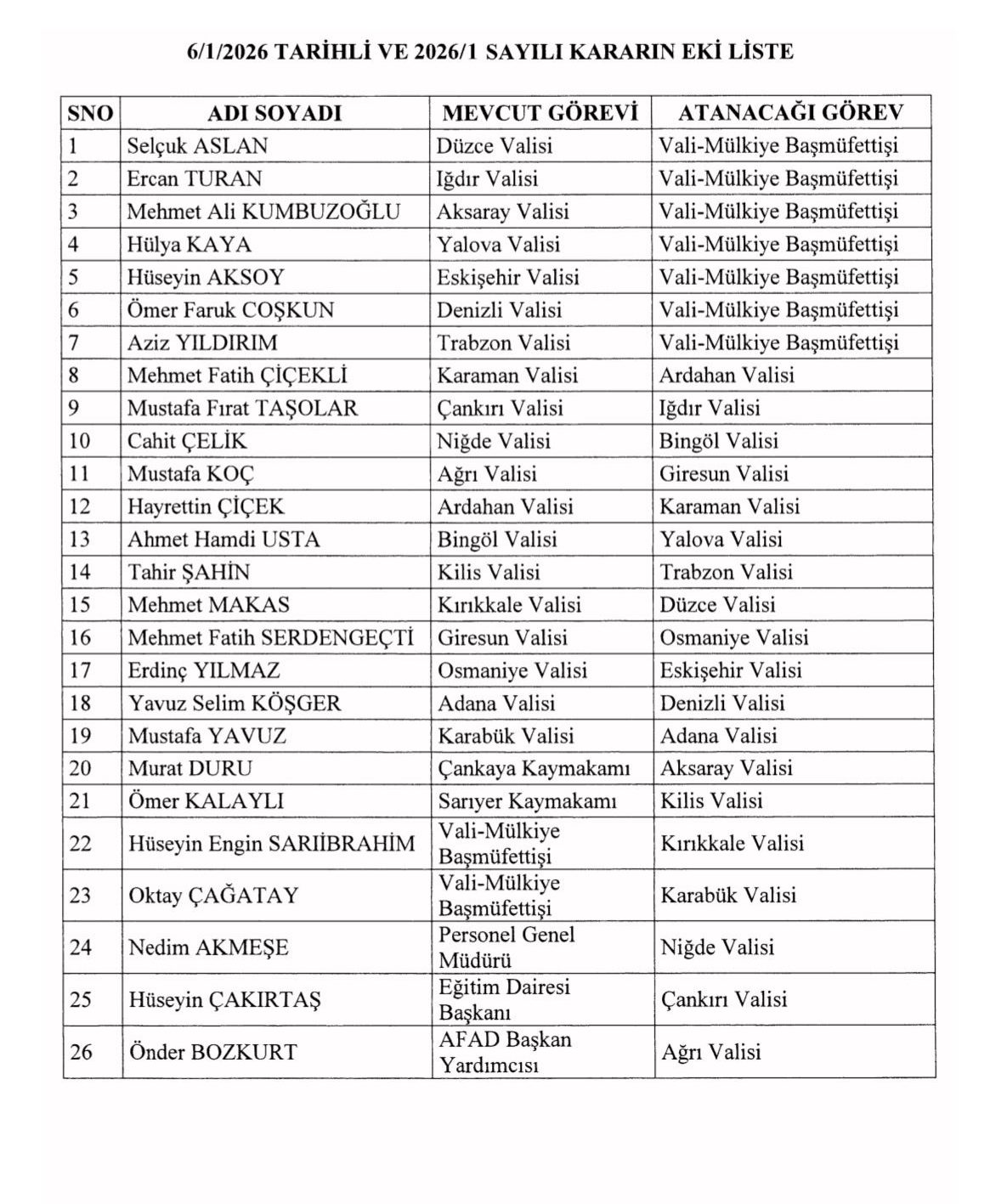 Cumhurbaşkanı Recep Tayyip Erdoğan imzasıyla yayımlanan kararname ile Düzce Valisi Selçuk Aslan, Iğdır Valisi Ercan Turan, Aksaray Valisi Mehmet Ali Kumbuzoğlu, Yalova Valisi Hülya Kaya, Eskişehir Valisi Hüseyin Aksoy, Denizli Valisi Ömer Faruk Coşkun ve Trabzon Valisi Aziz Yıldırım, “vali-mülkiye başmüfettişliği” görevine getirildi.